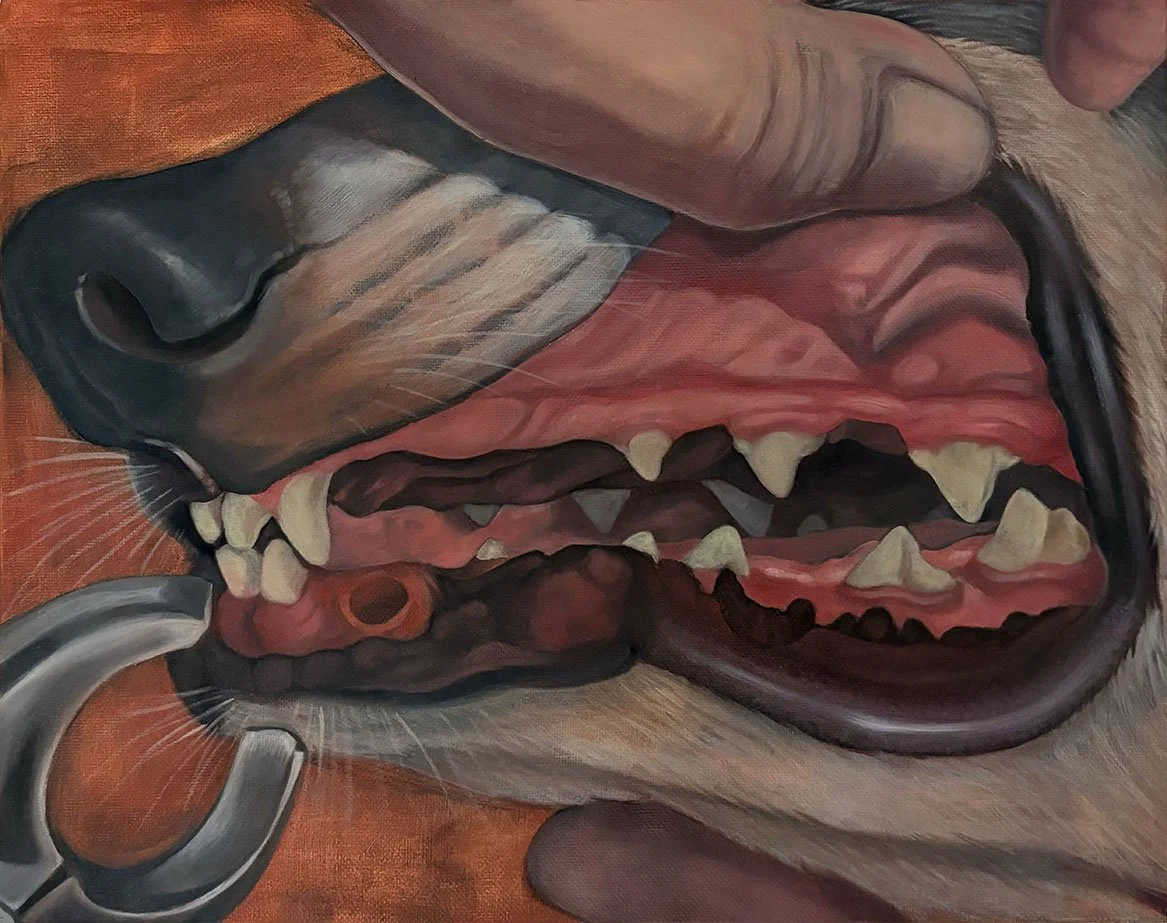 A dog’s mouth is pulled open to reveal large, pointed teeth, with a visible gap where a lower canine tooth is missing. A pair of pliers reaches from the corner of the canvas, open to grasp the next tooth for extraction.