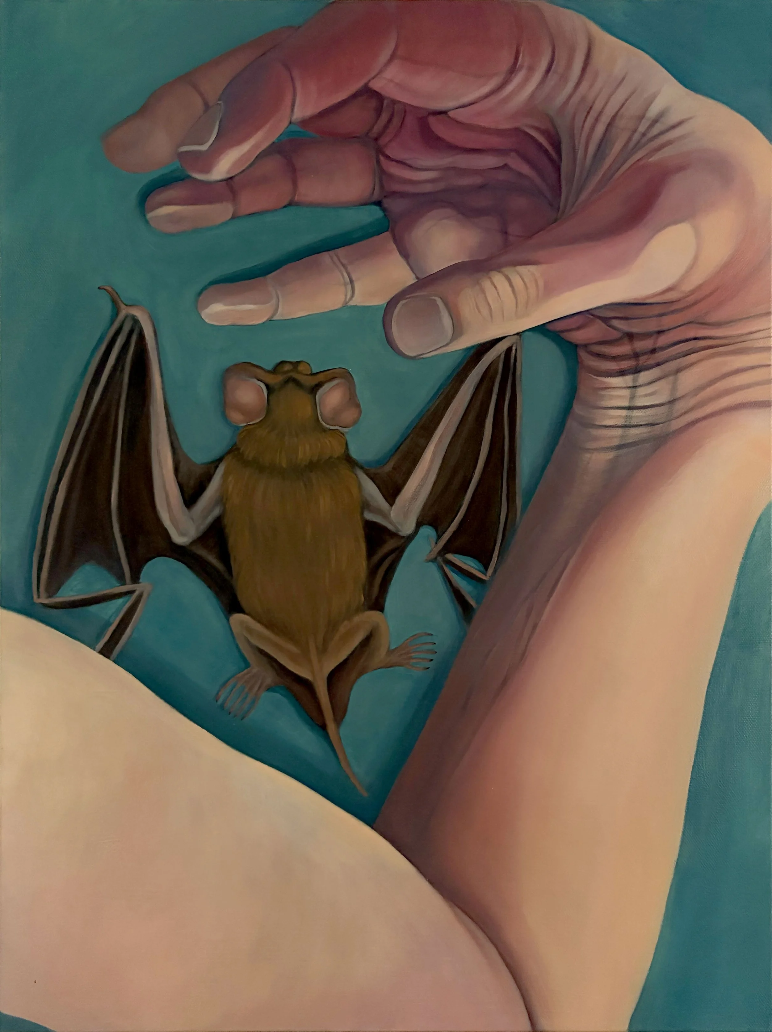 An arm curves around the body of a small mexican free-tailed bat. The fingers of the hand are curved, mimicking the shape of the bat’s resting wings.